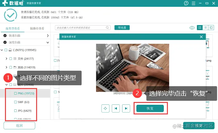 3.等待扫描完成,电脑中的照片会按不同的类型进行分类,找到你所需恢复的类型,并进行选择,选择完毕后点击 【恢复】 ;