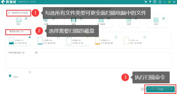 2.运行软件后,在界面上选择【勾选所有文件类型】(可以帮你更全面扫描到电脑里的各种文件),再选择需要扫描的磁盘,并执行【扫描】命令;