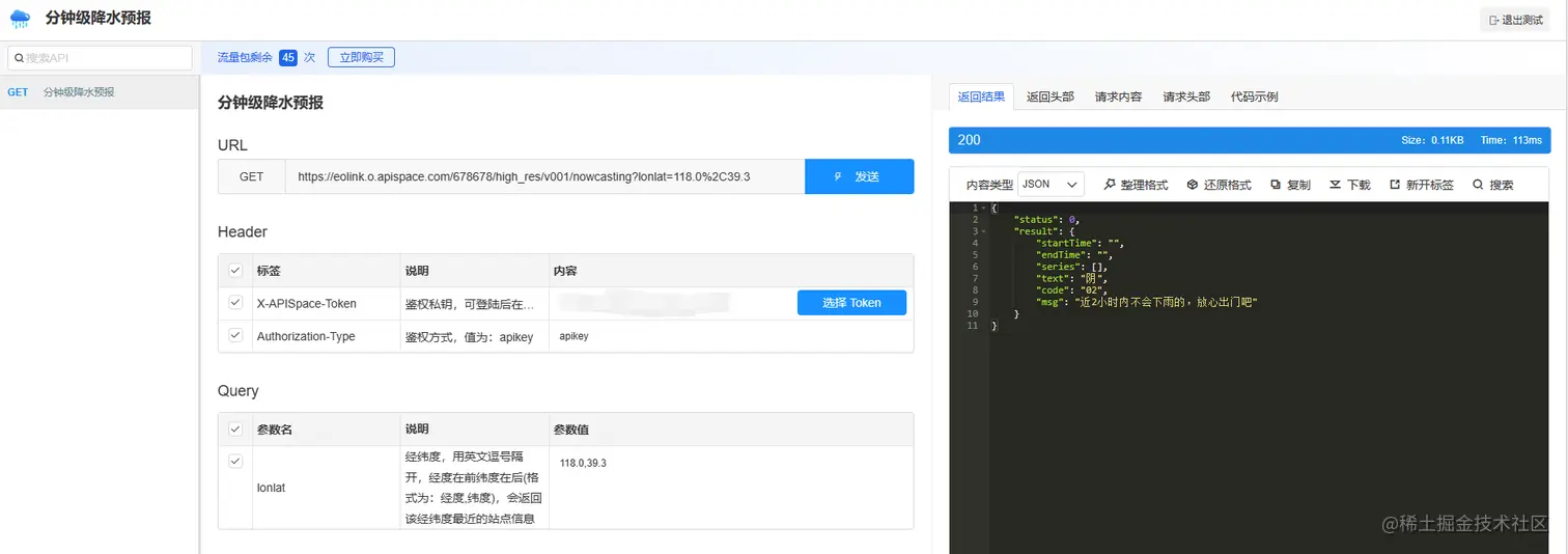 好啦~到这里分钟级降水预报的接口的使用步骤就介绍完了,短短三步,就能快速使用并接入API!感兴趣的同学可以试一试,一分钟搞定!