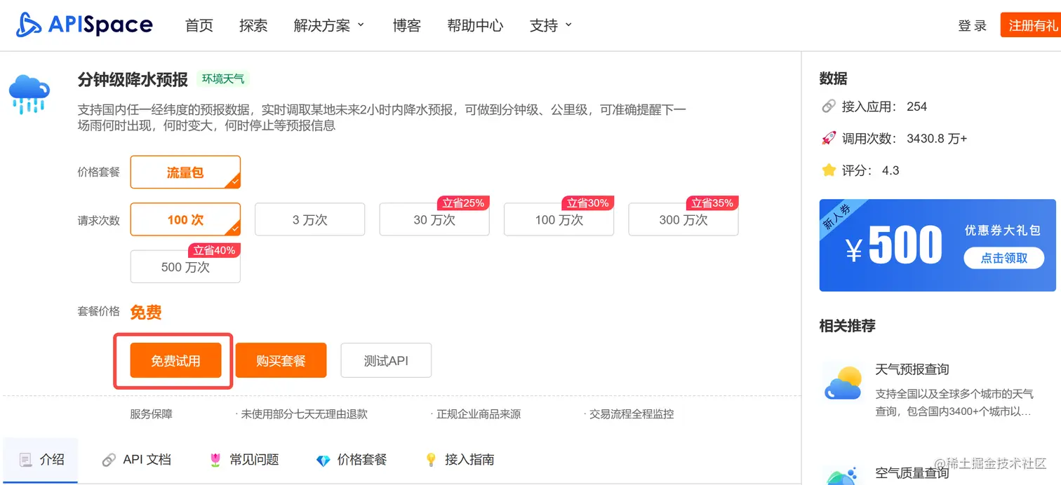注册登录 APISpace 之后,在 分钟级降水预报 的右上角中可以看到【免费试用】的按钮,点击即可获得相应的免费次数。