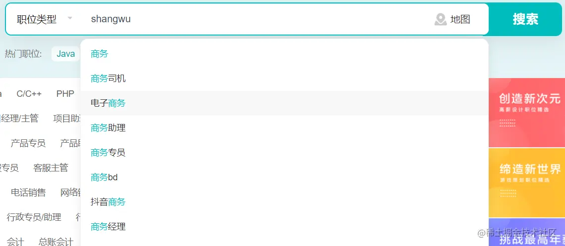 搜索提示的情况比较多,比如根据拼音全拼、拼音首字母、中文等等,我们看看 boss 直聘 的搜索提示是怎么做的。
