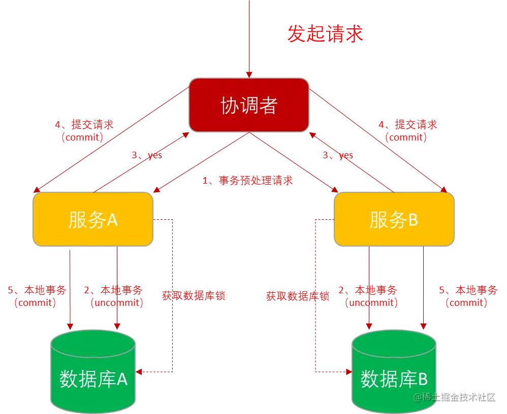 2、在第一阶段和第二阶段中插入一个准备阶段。保证了在最后提交阶段之前各参与节点的状态是一致的。