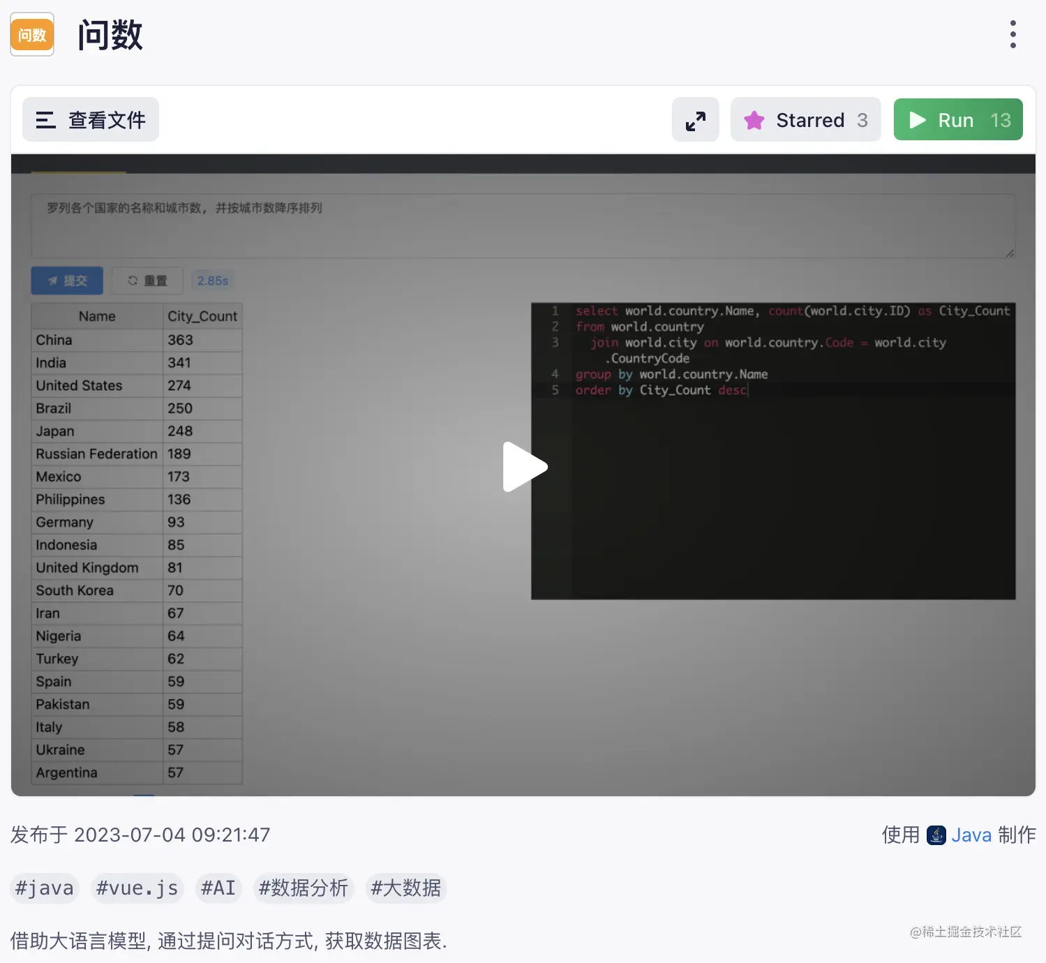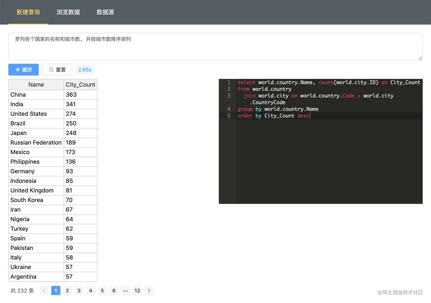 输入您的问题, 点击提交, 将自动翻译成 SQL, 并完成取数, 如下截图.