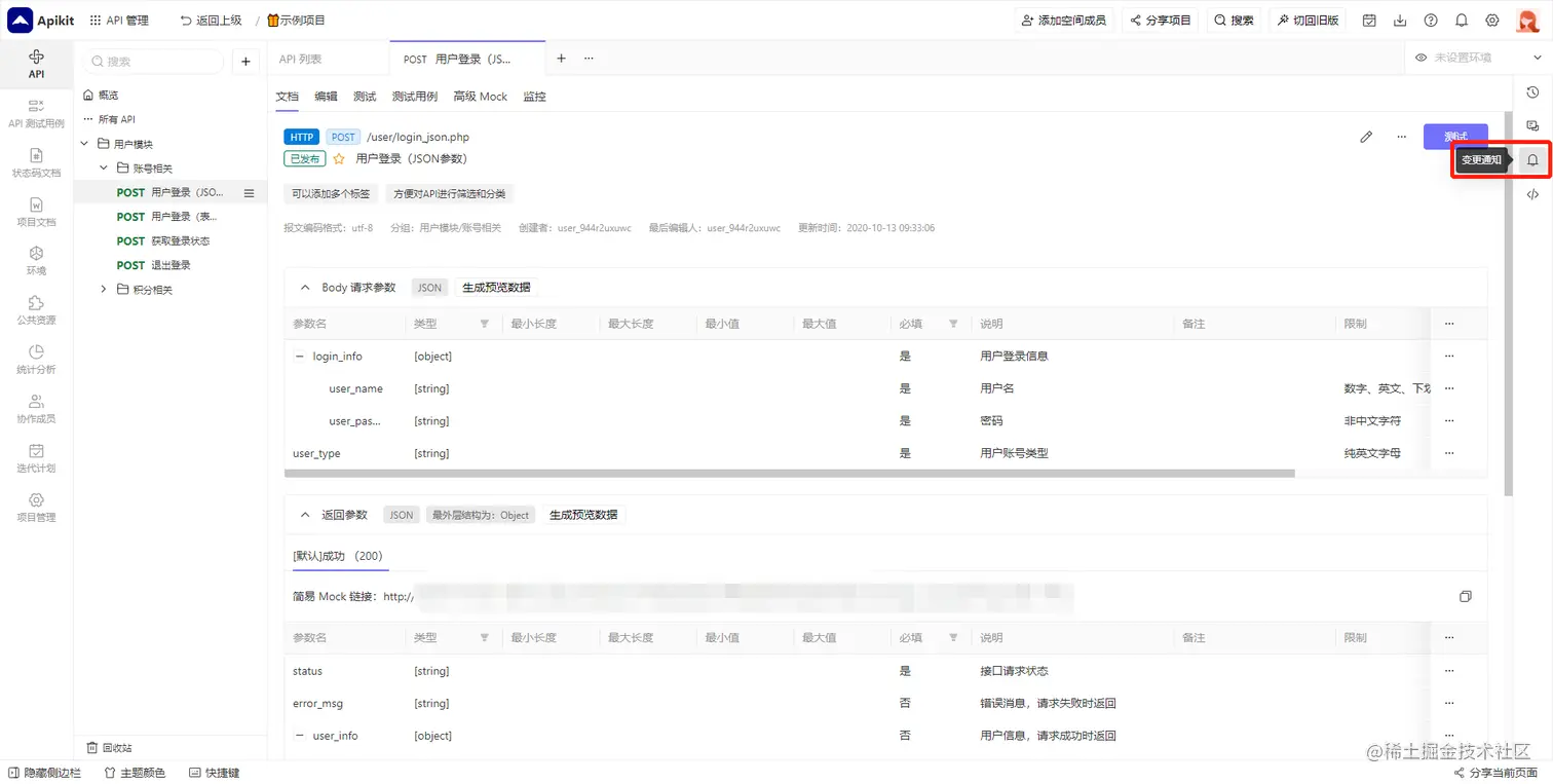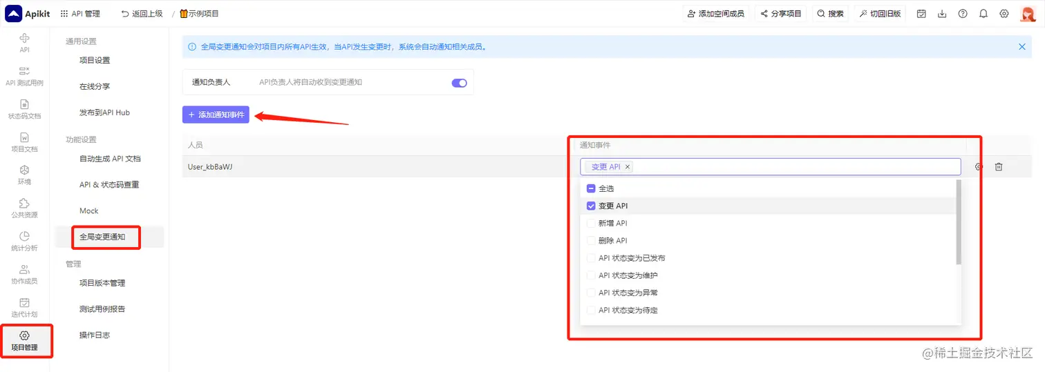Apikit 自学日记:API 变更通知 CV_coder 2023-07-04 233 阅读1分钟 API 变更通知 您可以设置当API状态或者内容改变时自动通过站内信或者邮件等方式通知相关的成员。 设置单个 API 变更通知 进入API详情页,点击 通知 按钮,在弹窗中添加通知事件,选择通知的人员以及通知触发事件即可。 设置全局 API 变更通知 进入项目管理页面,点击 全局变更通知 标签,选择通知的人员以及通知触发事件即可。