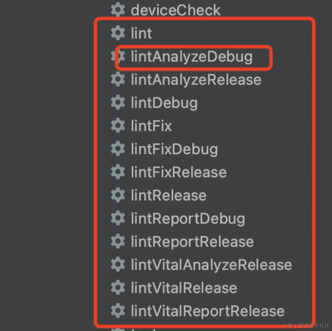 猛的一看确实不知如何下手,根据名字判断lintDebug应该是入口task,运行一下发现是对的。查看一下它的依赖,找到核心task。运行下面的命令: