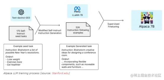 斯坦福大学的研究人员在今年3月发布了Alpaca,这是一种基于LLaMA 7B LLM之后的指令。他们在由InstructGPT生成的52,000个指令遵循示例的数据集上对LLaMA模型进行了微调。
