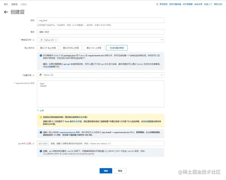 我选择的是在线构建依赖层,按照requirements.txt的格式书写,然后就可以在线安装了,很方便。创建成功之后,回到编辑层位置,选择刚开始创建的层,点击确定,既可,这样就不会再报相关依赖缺失了。