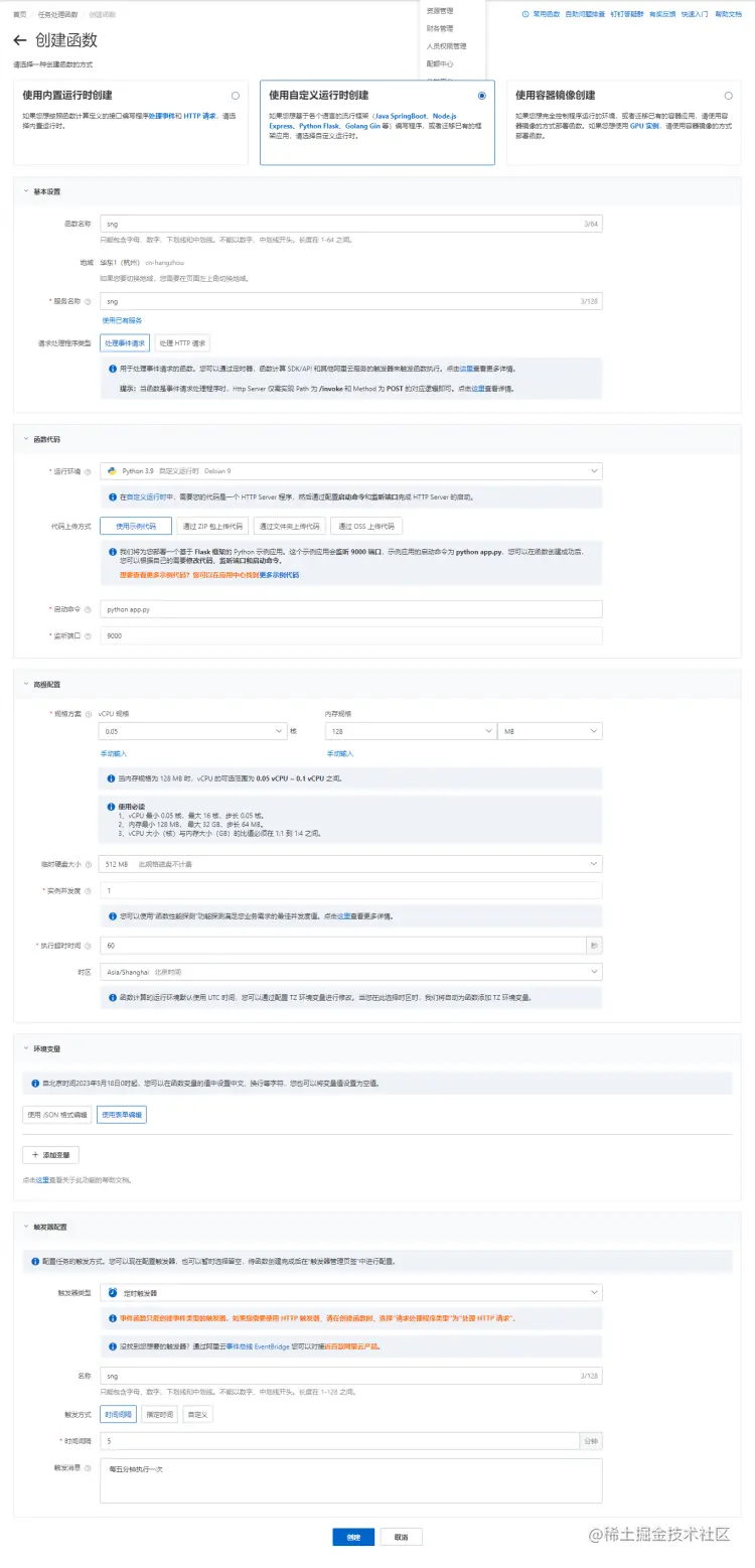 - 函数方式:我的小脚本是python 代码,我直接使用自定义运行环境,如果你想了解这三种方式区别,建议详细阅读这篇文章:函数计算支持的多语言运行时信息