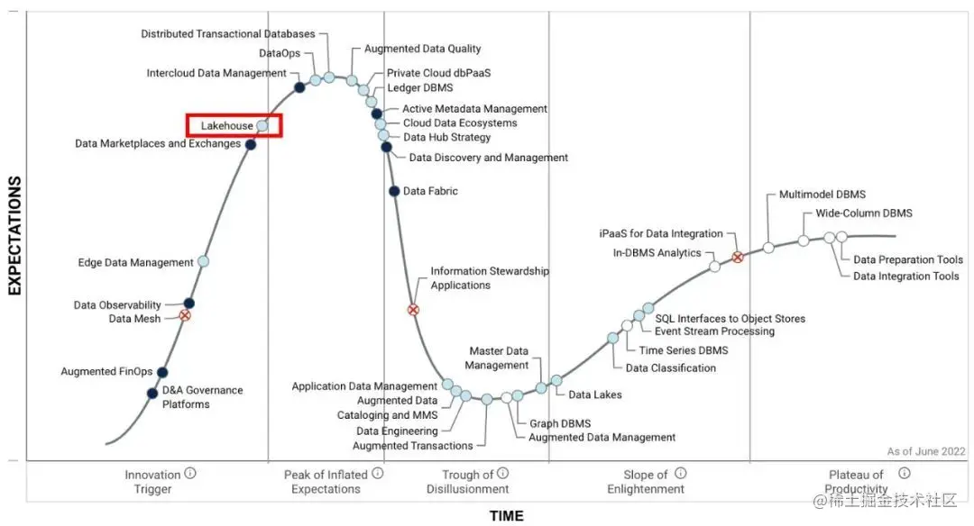 当然不是,湖仓一体是一种新的架构模式,虽然它将数据仓库与数据湖的优势充分结合,但它不同于数仓和数据湖的架构。很多新技术和新概念的出现都会伴随着用户的质疑,尤其是在中国数字化快速发展的过程中,甚至出现过昙花一现的新概念,让很多企业投入了无效资源。就湖仓一体这个概念,我们不妨参考下国际权威咨询机构 Gartner 对湖仓一体(Lakehouse)的定位,可以看到湖仓一体正处于快速发展的通道。