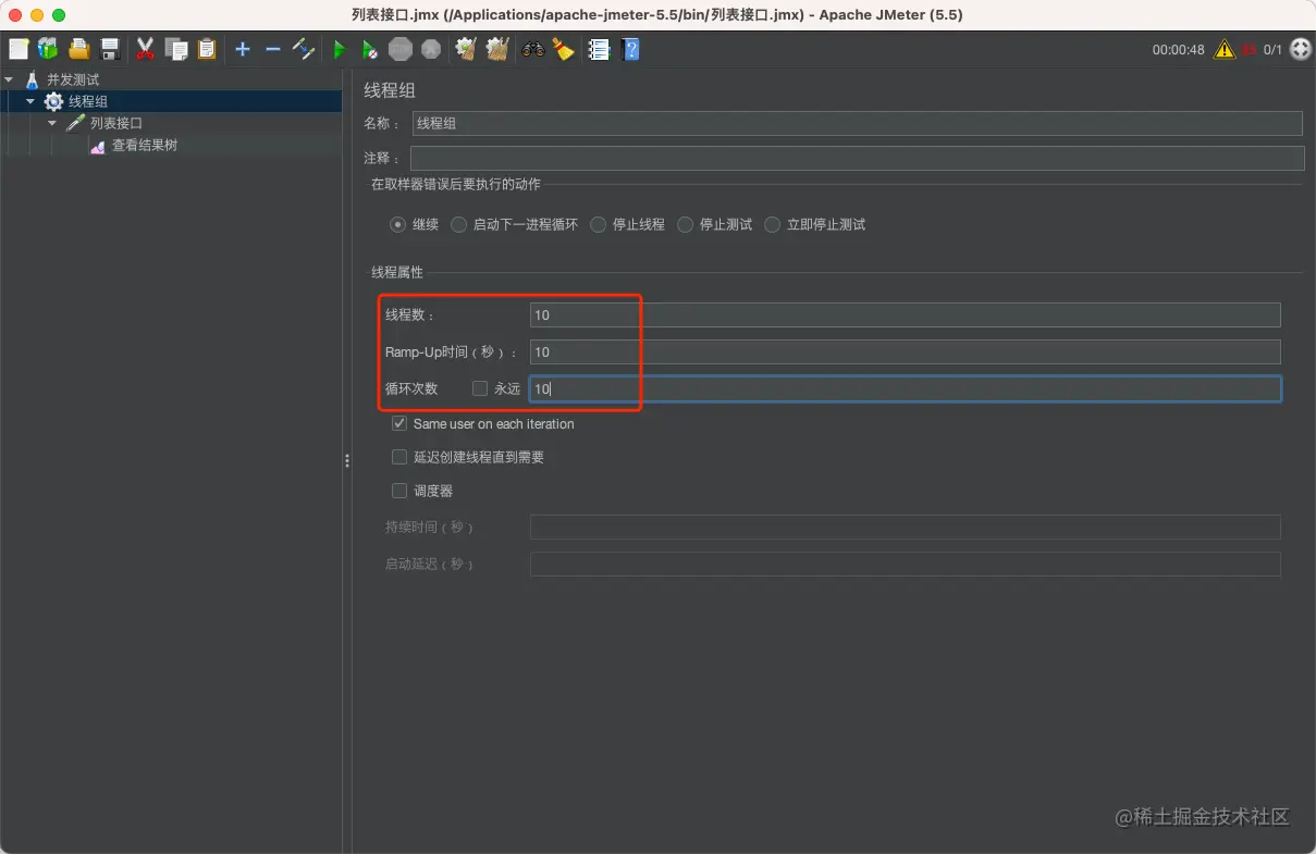 - Ramp-Up 时间 (秒):线程准备时长。如果线程数为 10,准备时长为 10,那么需要 1秒钟启动 1 个线程。