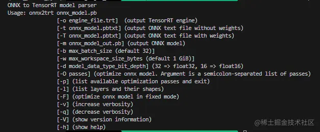 这里直接执行 build.sh 就能编译成功,完了在编译目录 build 下就会编译出我们想要的可执行程序 onnx2trt,可以执行验证一下: