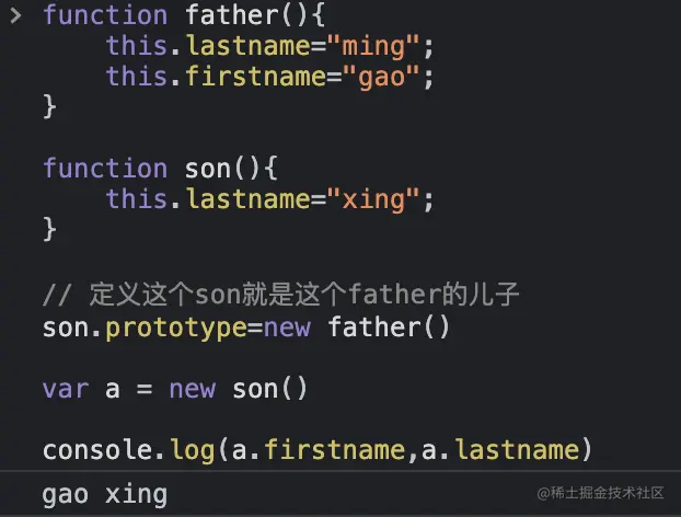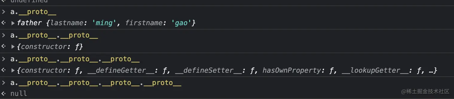 整个过程在js引擎中可以理解为,输出a的firstname时候,首先查找son的定义,若是没有,则查找son.__proto__中的定义,也就是他继承的father里面的定义,若还是没有,则继续son.proto.__proto__中的定义。直到查找到为止或者直接到null为止