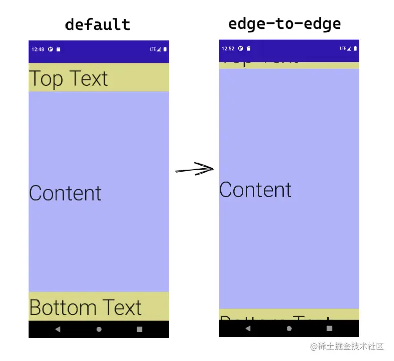 - edge-to-edge: app的内容在system bars后面绘制, system bars仍然以半透明的形式存在.