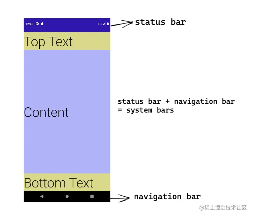 除了app的内容区域外,还有一些其他的固定元素会显示在手机屏幕上,顶部的状态栏、 刘海、 底部的导航栏,还有输入法键盘,它们都是系统的UI, 也叫Insets.