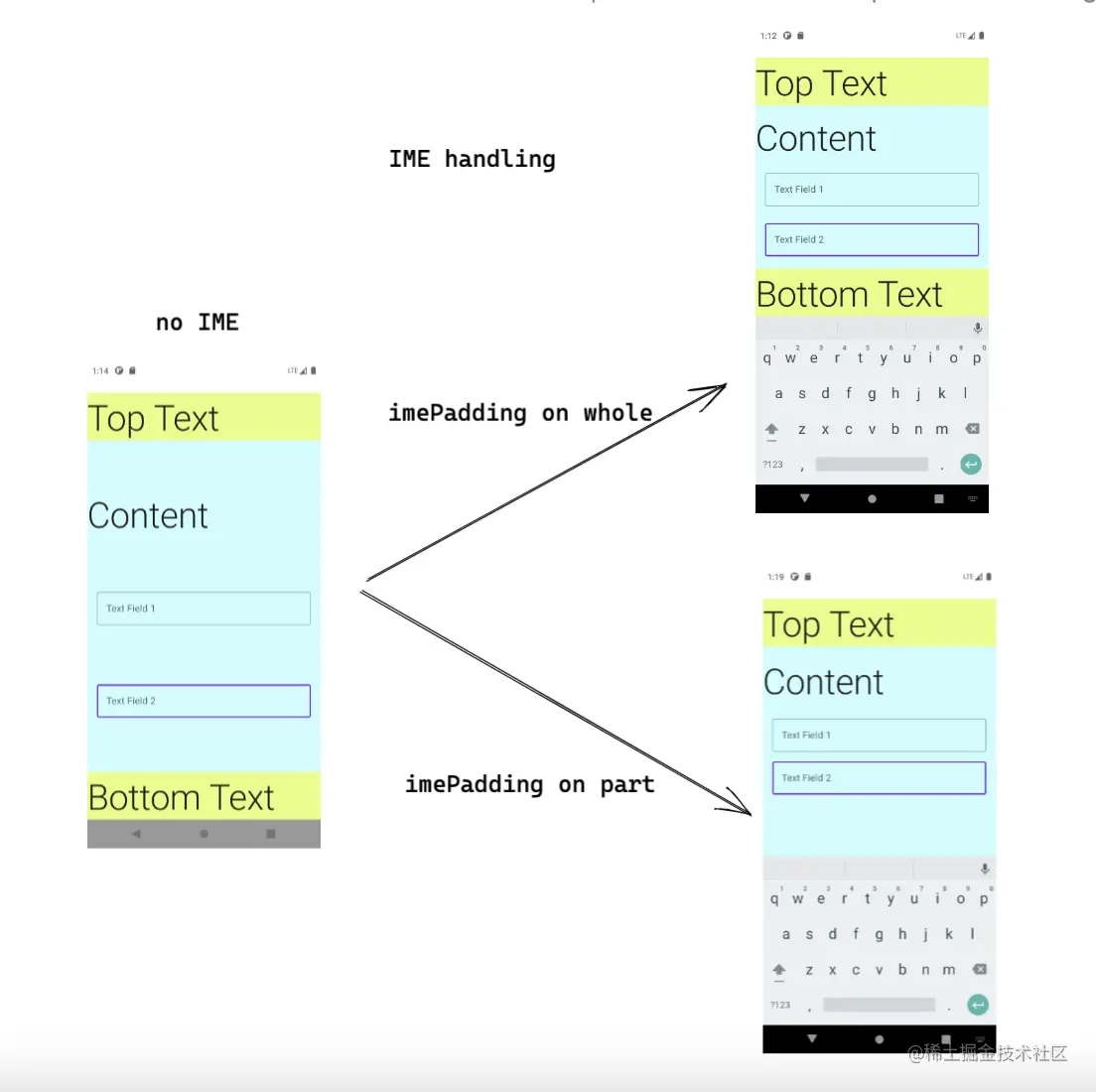 键盘弹出时, Bottom Text也会被顶上去, 这是因为imePadding作用于整块的布局.
