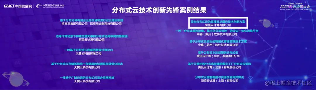 由中国信息通信研究院、中国通信标准化协会主办的第三届“云边协同大会”于 6 月 30 日在京举办。阿里云视频云团队凭借 《面向分布式云的直播及点播云技术创新方案》 在一众产品服务中脱颖而出,荣获「分布式云技术创新先锋案例」。