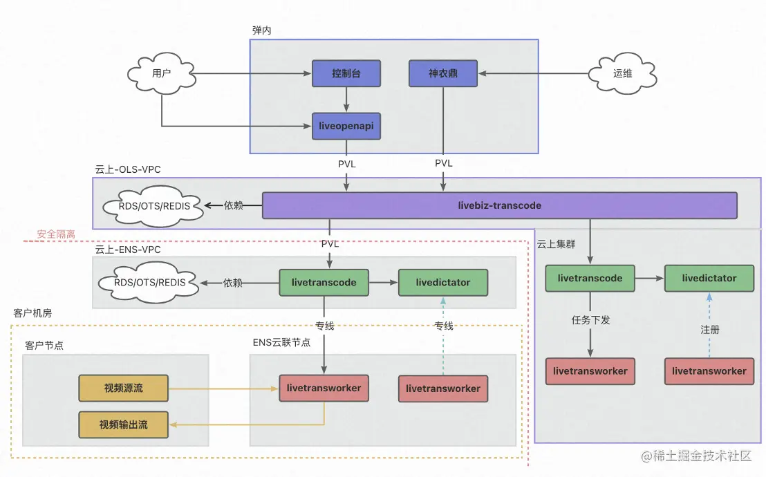 基于直播真实场景视角俯瞰,整体转码节点计算层任务作为数据平面,除在公共云外,可以下沉到边缘云节点,边缘云节点既可以是客户的机房,也可以是一个常规设备,只要具备转码已经支持的异构机器设备和指令集即可,整个直播转码/录制/时移等控制平面既可以在中心公共云上,也可以完全下沉到边缘集群,整体方案灵活,可以按需调整部署形态。