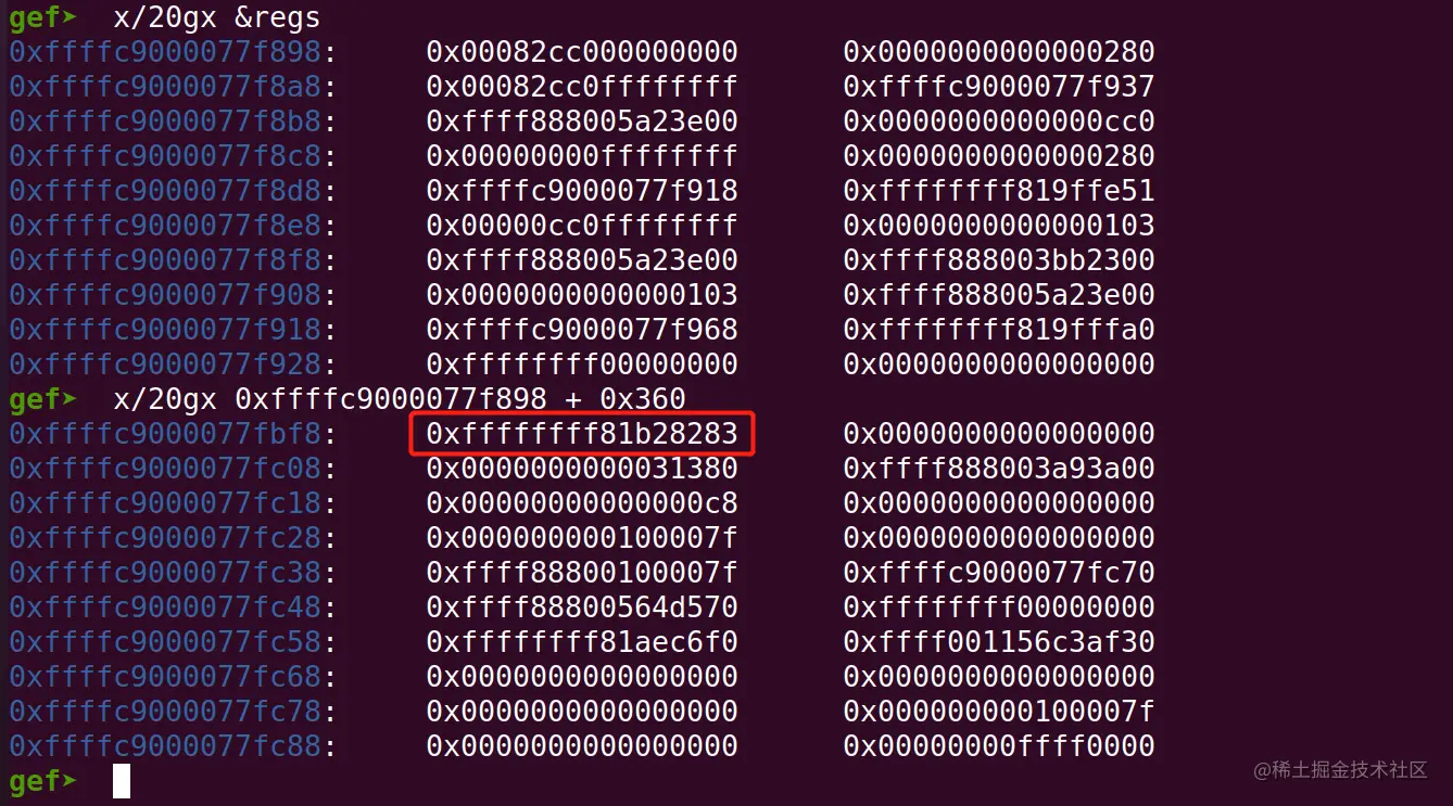 接着查看regs偏移0x3c0处的地址信息,结果发现在该片区域存在一个明显的内核地址,因此若能将这个地址进行泄露,我们就能获取内核的基地址。