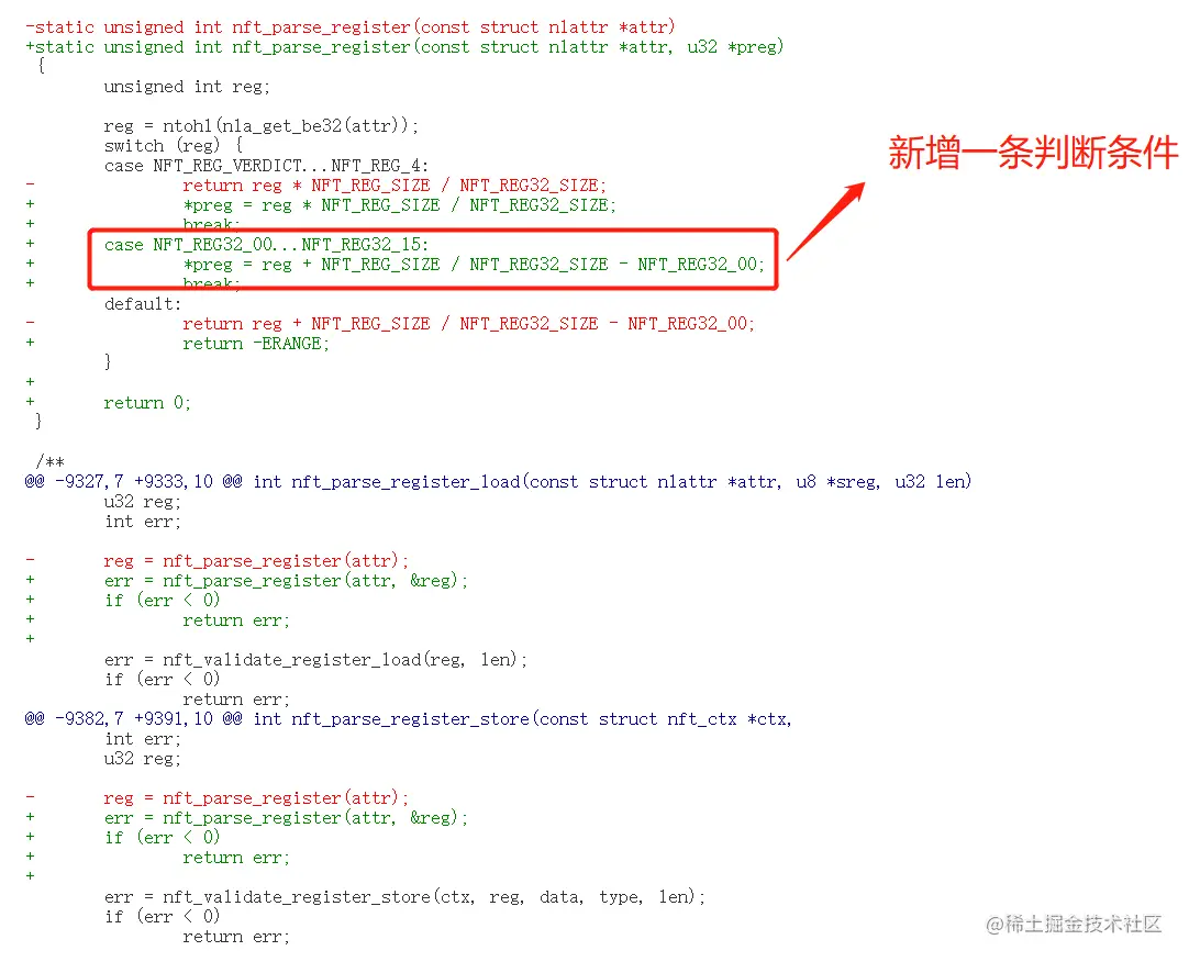 File: net\netfilter\nf_tables_api.c9278: static unsigned int nft_parse_register(const struct nlattr *attr)9279: {9280: unsigned int reg;9281: 9282: reg = ntohl(nla_get_be32(attr)); //提取数据包的寄存器下标,比如上述例子为89283: switch (reg) { //0 - 4是16字节寄存器9284: case NFT_REG_VERDICT...NFT_REG_4: 9285: return reg * NFT_REG_SIZE / NFT_REG32_SIZE; //reg * 49286: default: //由于4字节寄存器起始下标为8,因此要减去起始下标9287: return reg + NFT_REG_SIZE / NFT_REG32_SIZE - NFT_REG32_00; // reg - 49288: }9289: }