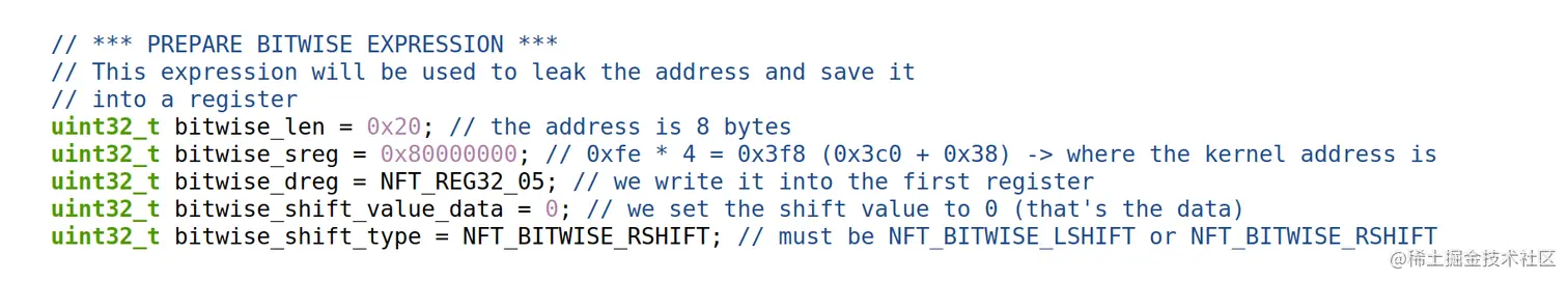 利用nft_bitwise泄露地址,这里注意的是在使用nft_bitwise泄露地址时,需要将data值设置为0,这样就不会进行移位而导致我们的内核地址被修改存储,最后将泄露的地址值放置在NFT_REG32_05下标的寄存器中