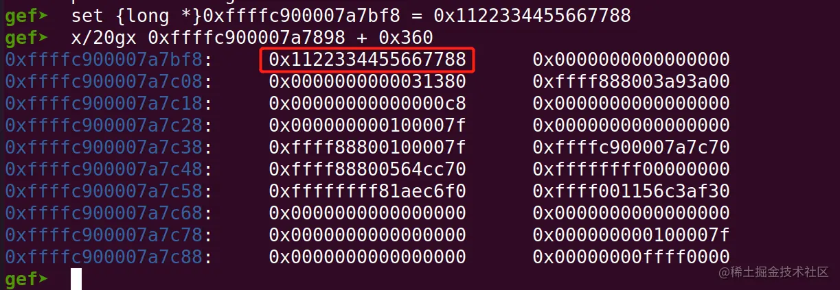 为了检验该地址是否能够修改程序的执行流程,可以使用一个方法,将该地址的值修改为非法值并观察内核是否会崩溃,这里将地址的内容修改为0x1122334455667788,接着运行程序。