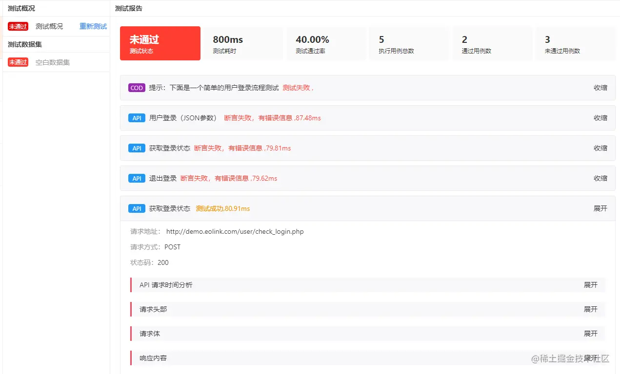 如下图是执行测试后的报告效果,您可以看到每个数据集、每个测试步骤的测试结果,结果中包括详细的请求时间、请求参数、返回结果等内容。