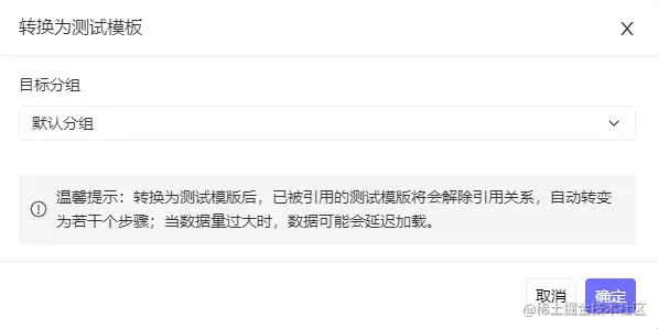 提示:转换为测试模板后,已被引用的测试模板将会解除引用关系,自动转变为若干个步骤