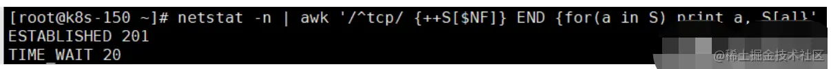 netstat -n | awk '/^tcp/ {++S[$NF]} END {for(a in S) print a, S[a]}'
