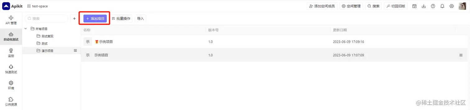 Apikit 自学日记:创建自动化测试项目 CV_coder 2023-07-04 103 阅读1分钟 在API 自动化测试中,所有的测试用例都是以项目维度来进行管理,一个自动化测试项目可以从多个API文档项目中引用API信息来创建API测试用例。 点击左侧菜单栏,进入 API****自动化测试 项目列表页,点击添加按钮: 在弹窗中输入相应的信息,点击确定即可: 在创建项目时,您也可以指定一位空间内的成员成为该项目的初始管理员,他能够帮助您进行项目内的人员权限管理工作,如绑定空间内的成员到该项目,或者修改某个成员的操作权限等。