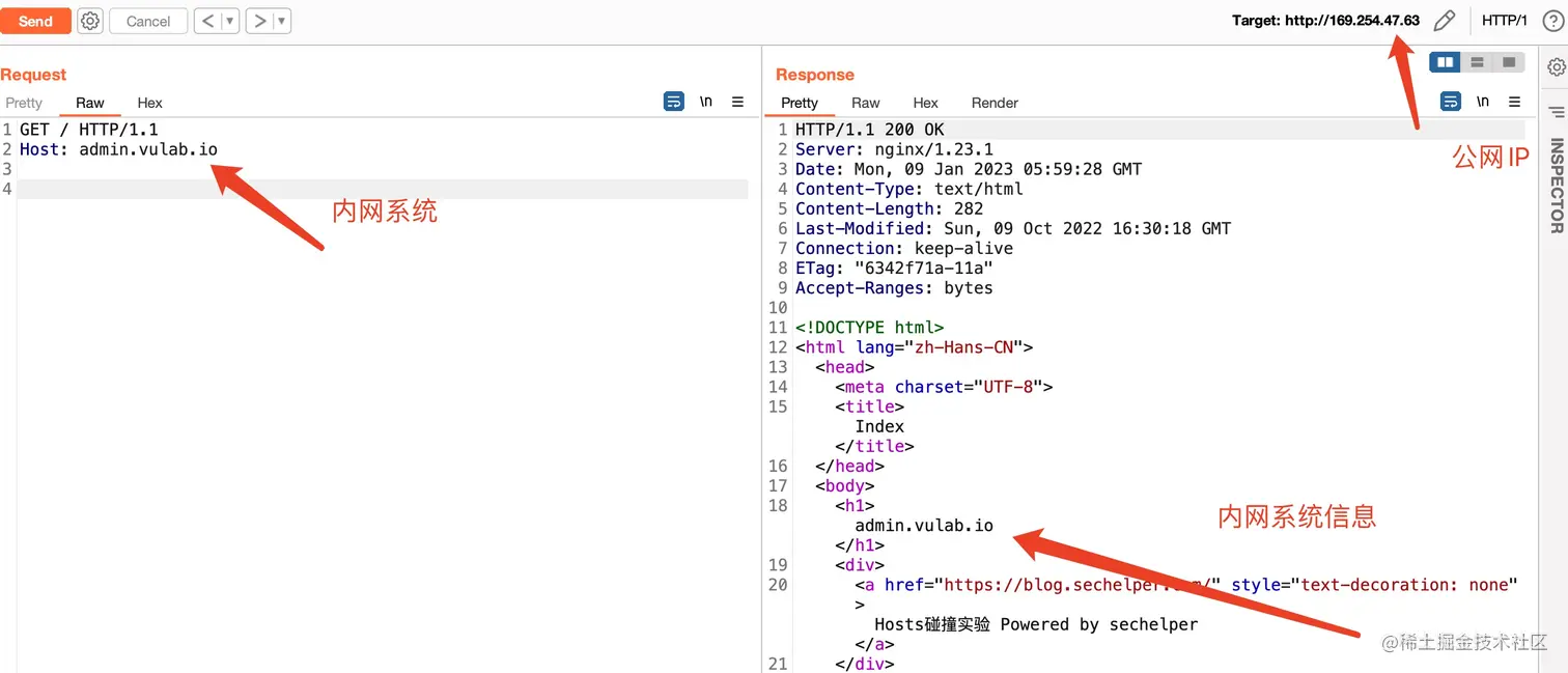 通过对 IP 和 域名 碰撞匹配,访问到绑定host才能访问的系统,当直接访问IP回显4xx错误,直接指定HOST头为某个域名时访问该IP回显正常时,可判断可进行HOSTS碰撞。