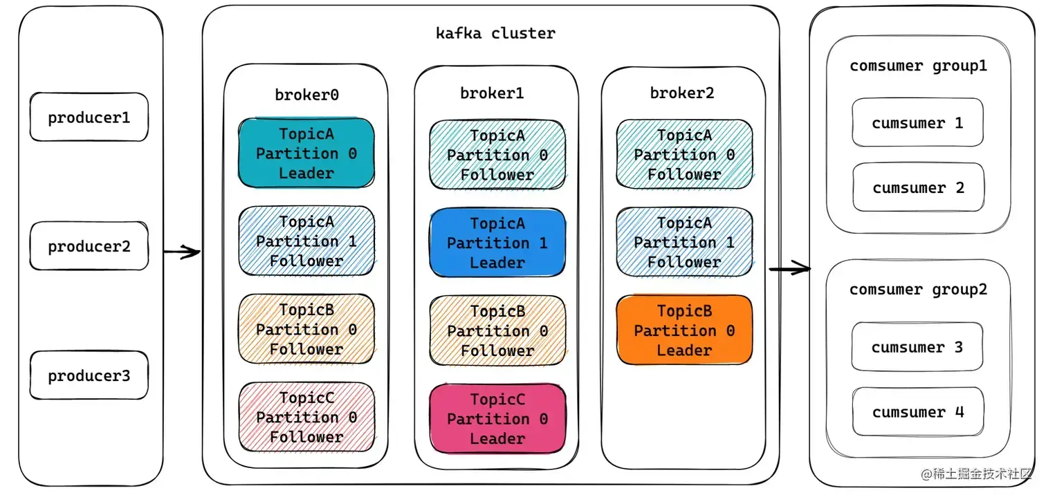 broker在Kafka中是实际的物理服务,多台broker构成Kafka集群。Kafka中的核心是topic,topic是一个逻辑概念,对于实际用户使用/编程角度来讲,只需感知到topic层即可,topic实际是由物理层的partition组成。partition按照leader-follower的架构分布在broker上,消费者实际是跟partition打交道的,这里的partition类似RabbitMQ中的queue。详情可看 www.modb.pro/db/585123