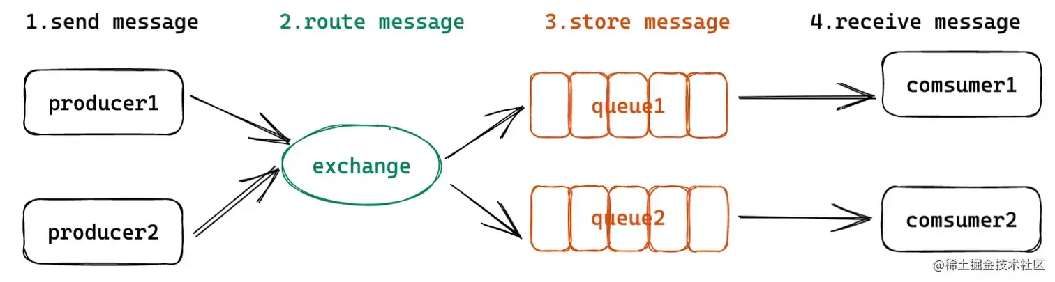 RabbitMQ中的核心是queue,queue负责存储、分发消息;生产者通过exchange向queue发送消息,exchange承担消息路由的角色,消费者连接到队列并取消息进行处理。这种架构模式使得RabbitMQ具备发布订阅、topic分发、同步RPC调用等通信模型。详情可看