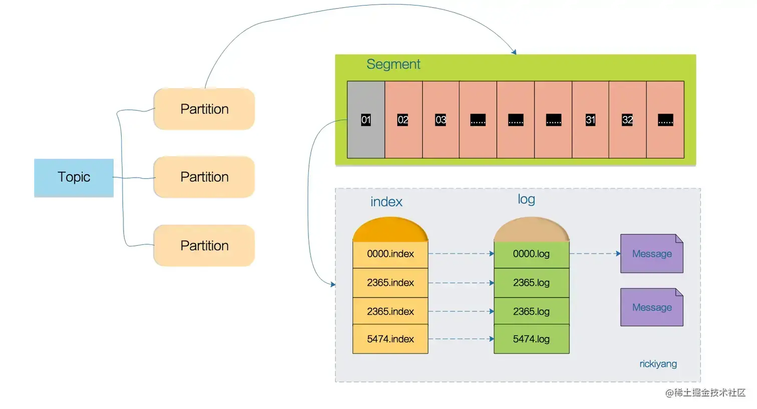 Kafka的消息存储以partition为单位;而partition又由多个segment构成,相当于一种分片机制。segment的底层的存储由index和log文件构成,index存储每个消息的offset索引,log文件存储实际的消息内容。详情可见