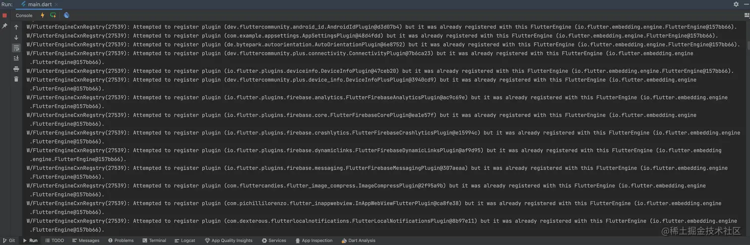 今天在编译项目的时候,突然留意到控制台输出的一段日志,大概意思就说:尝试注册插件,但是该插件已经在此 FlutterEngine 中注册了...