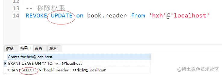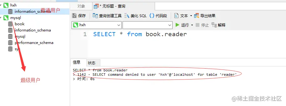 测试如下:删除reader表失败,因为我们并未赋予它有删除数据的权限