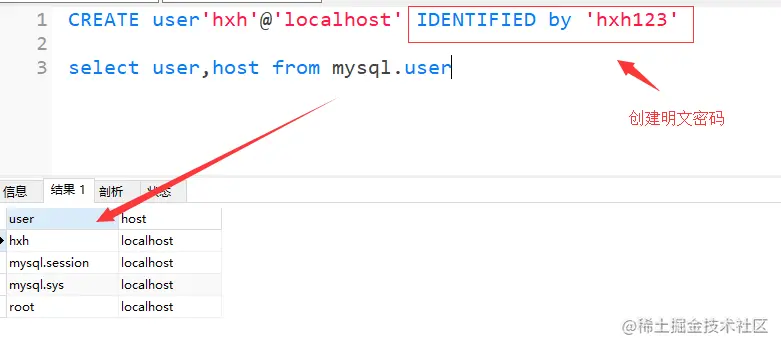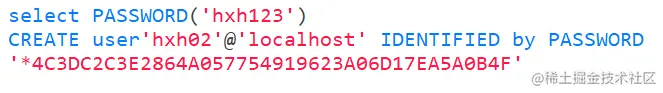 注意:如果普通用户不想创建密码,则identified后面全部省略即可,如果想创建hash密码如下: