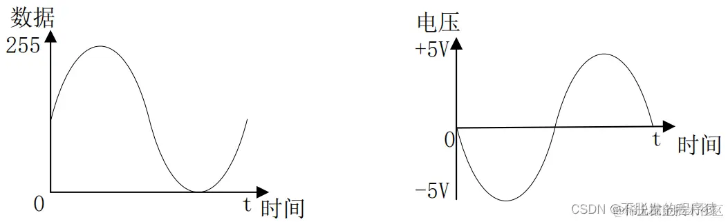 由上图可知,数据在 0 至 255 之间按照正弦波的波形变化,最终得到的电压也会按照正弦波波形变化,当输入数据重复按照正弦波的波形数据变化时,那么 AD9708 就可以持续不断的输出正弦波的模拟电压波形。需要注意的是,最终得到的 AD9708 的输出电压变化范围由其外部电路决定的,当输入数据为 0 时,AD9708 输出+5V 的电压;当输入数据为 255 时,AD9708 输出-5V 的电压。
