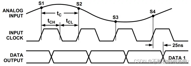 模拟信号转换成数字信号并不是当前周期就能转换完成,从采集模拟信号开始到输出数据需要经过 3 个时钟周期。比如上图中在时钟 CLK 的上升沿沿采集的模拟电压信号 S1,经过 3 个时钟周期后(实际上再加上 25ns 的时间延时),输出转换后的数据 DATA1。需要注意的是,AD9280 芯片的最大转换速度是32MSPS,即输入的时钟最大频率为 32MHz。