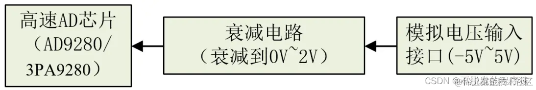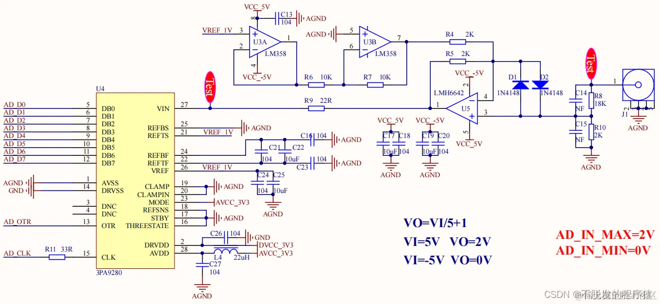 图中输入的模拟信号 SMA_IN(VI)经过衰减电路后得到 AD_IN2(VO)信号,两个模拟电压信号之间的关系是 VO=VI/5+1,即当 VI=5V 时,VO=2V;VI=-5V 时,VO=0V。