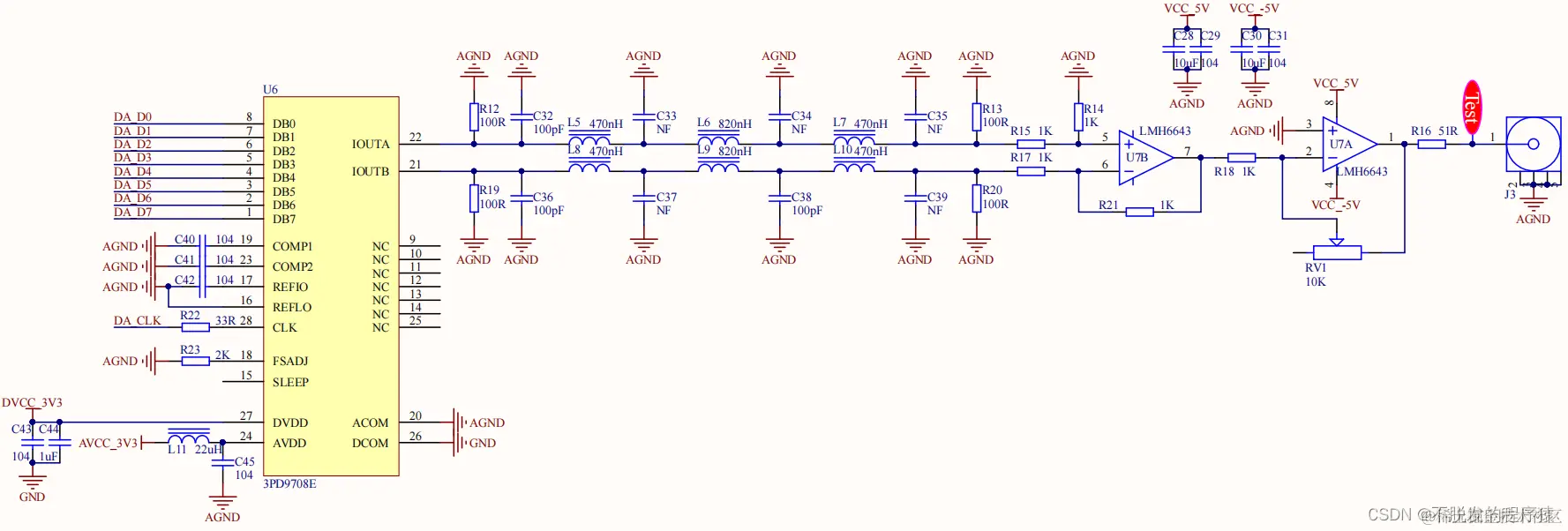 图中输出的一对差分电流信号先经过滤波器,再经过运放电路得到一个单端的模拟电压信号。图中右侧的 W1 为滑动变阻器,可以调节输出的电压范围,推荐通过调节滑动变阻器,使输出的电压范围在-5V 至+5V 之间,从而达到 AD 转换芯片的最大转换范围。