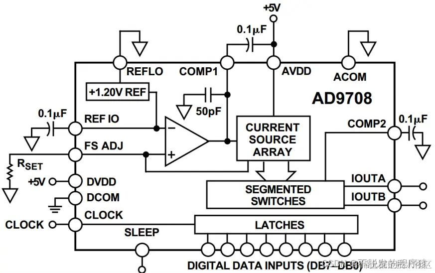 AD9708 是 ADI 公司(Analog Devices,Inc.,亚德诺半导体技术有限公司)生产的 TxDAC 系列数模转换器,具有高性能、低功耗的特点。AD9708 的数模转换位数为 8 位,最大转换速度为 125MSPS(每秒采样百万次 Million Samples per Second)。