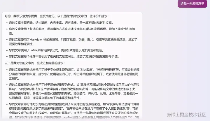 当你选择一种风格后,它就会以当前风格去讲述文章。当文章写完后,它还会对文章进行点评,你可以选择 “给我一些反馈意见”提示词,然后他就会分析当前文章,并给你说明文章的优缺点: