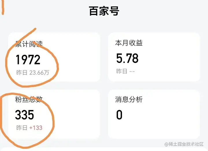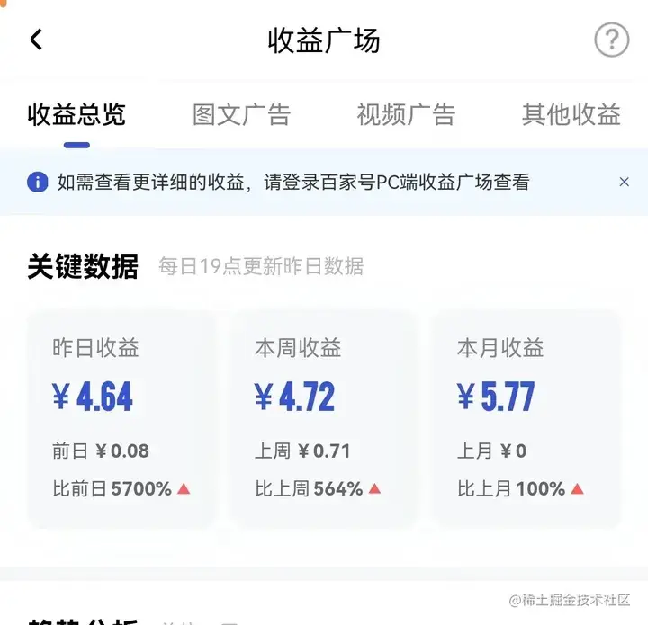 自从百家号上次赚了8毛钱后,这几天每天发动态和图文,做到了日更,收益也上来了,从每天的几分钱干到了每天1块钱了。昨天也是突破了一下大关(阅读量23万的大关),粉丝昨天一天涨了100多个。简简单单的赚了4块多,哈哈,这点小钱要不要太丢人啊。给大家看一下数据: