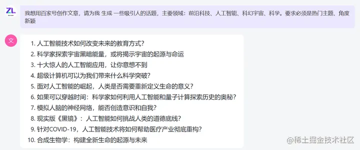 由于最近摸索到了百家号图文的一些门道,所以我每次发图文都谨慎小心,上次说到我们到底能不能使用AI去写百家号的文章,经过我这两天的尝试,应该没啥问题,但是要保证原创度高,你可能需要在不同角度上去创作文章,那从哪些角度呢?就在你的垂直领域的基础上造主题,注意:我这里说的不是让你去热搜上搜主题,而是交给AI去创作主题,如果都是热搜上的话题,人与亦云,那么你用AI创作文档的原创度就会大大降低。图文一定不要偏离自己的垂直领域,否则后期会影响你账号的推荐流量。 所以昨天也发了一篇用AI创作的文章,效果相比之前还不错。如果大家还摸不清图文的门道就去找阅读量比较高的看看人家是怎么写的就行了。在上一篇分享种我也大概写了一下,大家可以在星球中标贴中找找。我使用的工具是GPT-16k-0613,下面说说我的步骤:
