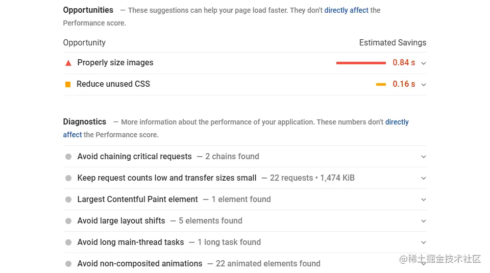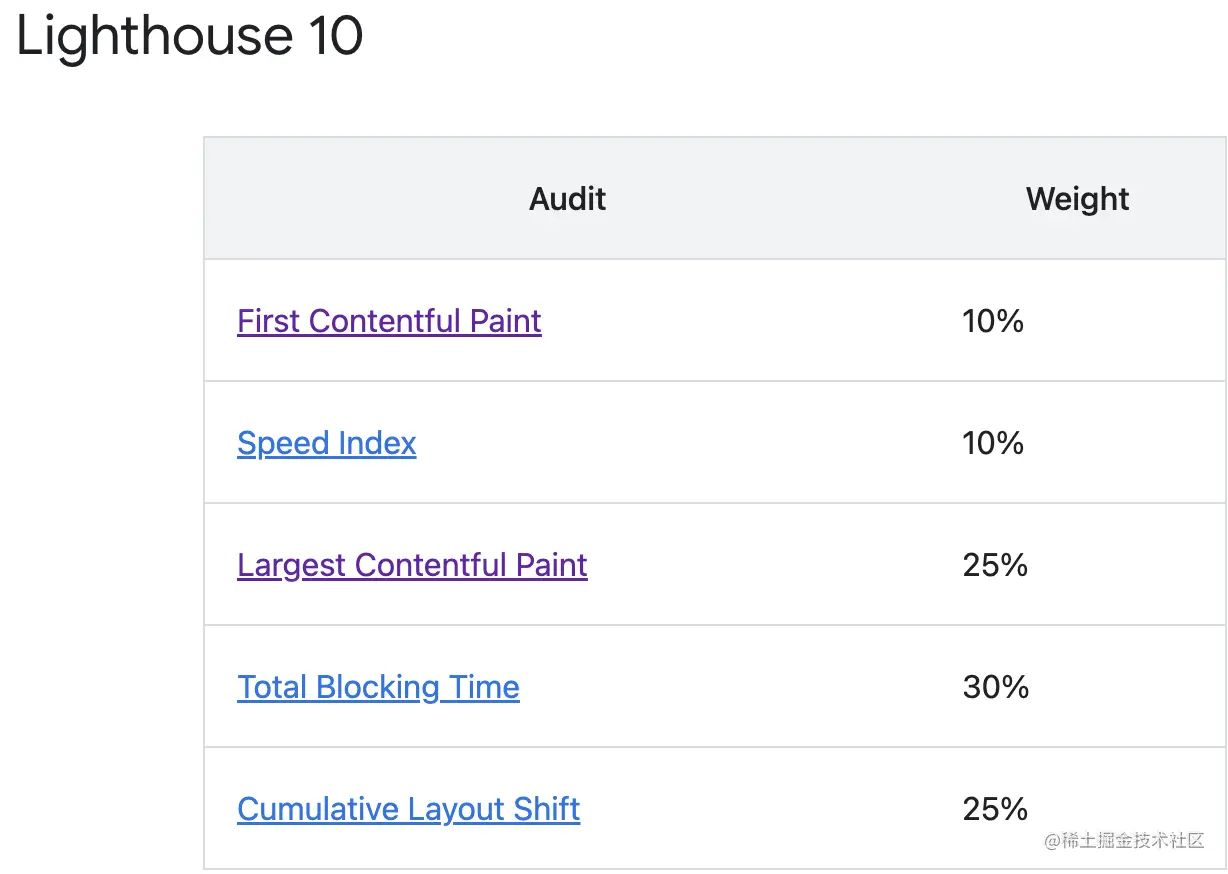 我们可以看到在Lighthouse(开源的自动化工具,用于评估网页性能和质量。)中针对FCP/LCP/SI等的权重。