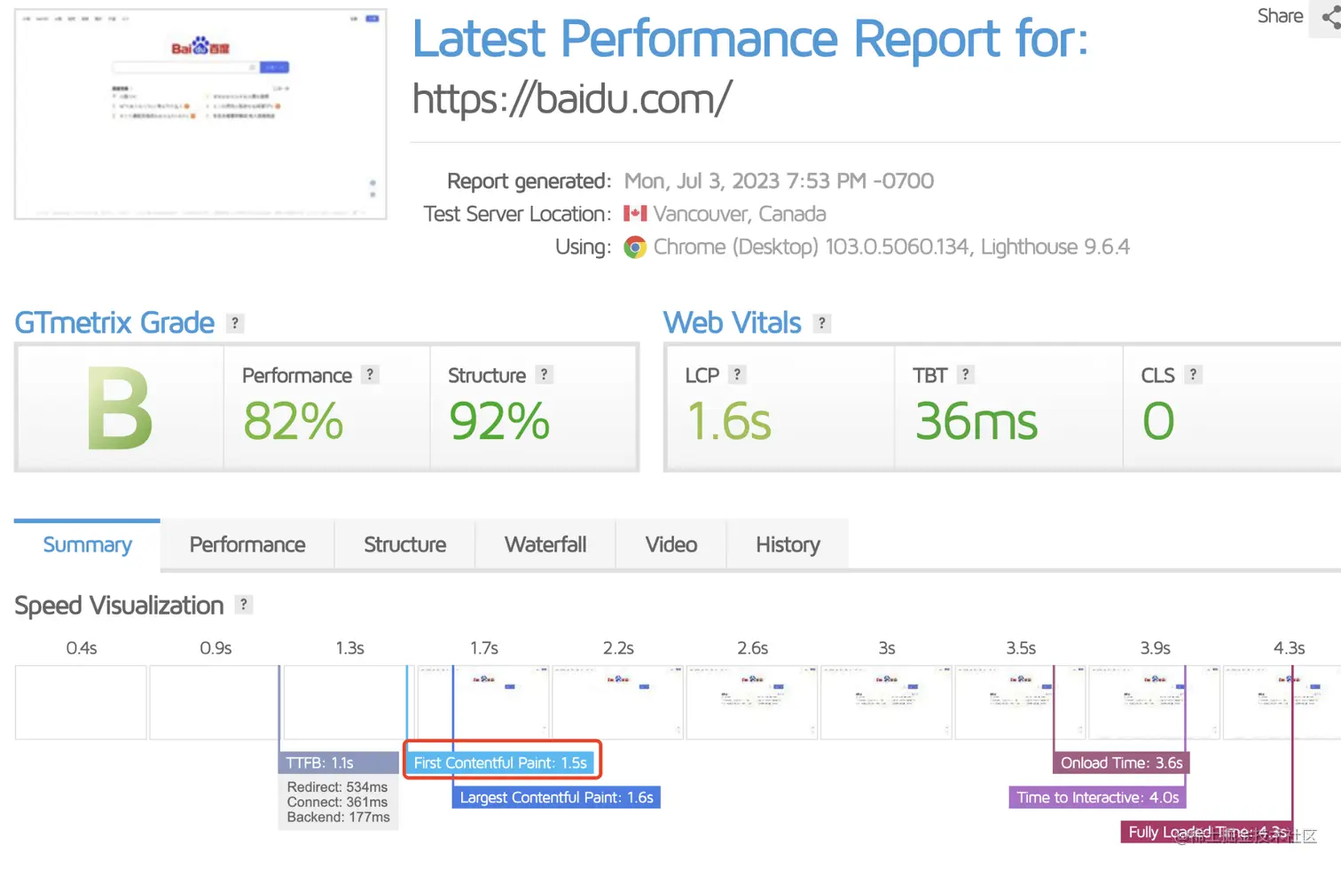 下图是使用GTmetrix对baidu的网站的性能分析。