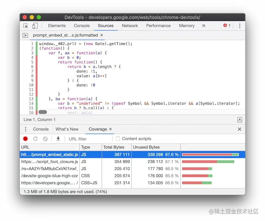 在Coverage选项卡中的表格显示了哪些资源被分析以及每个资源中使用的代码量。点击某一行,可以在Sources面板中打开该资源,并查看逐行分解的已使用代码和未使用代码。任何未使用的代码行开头都会有一条红线。