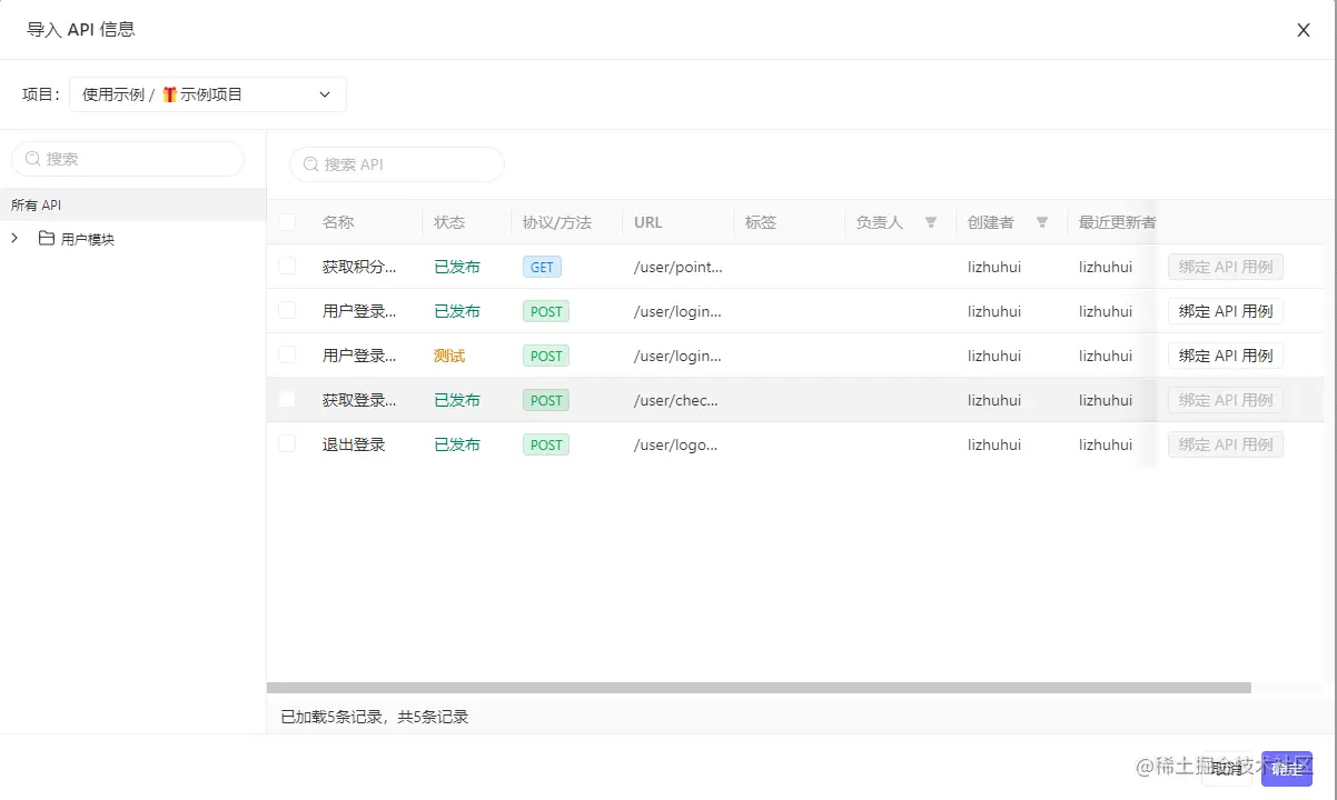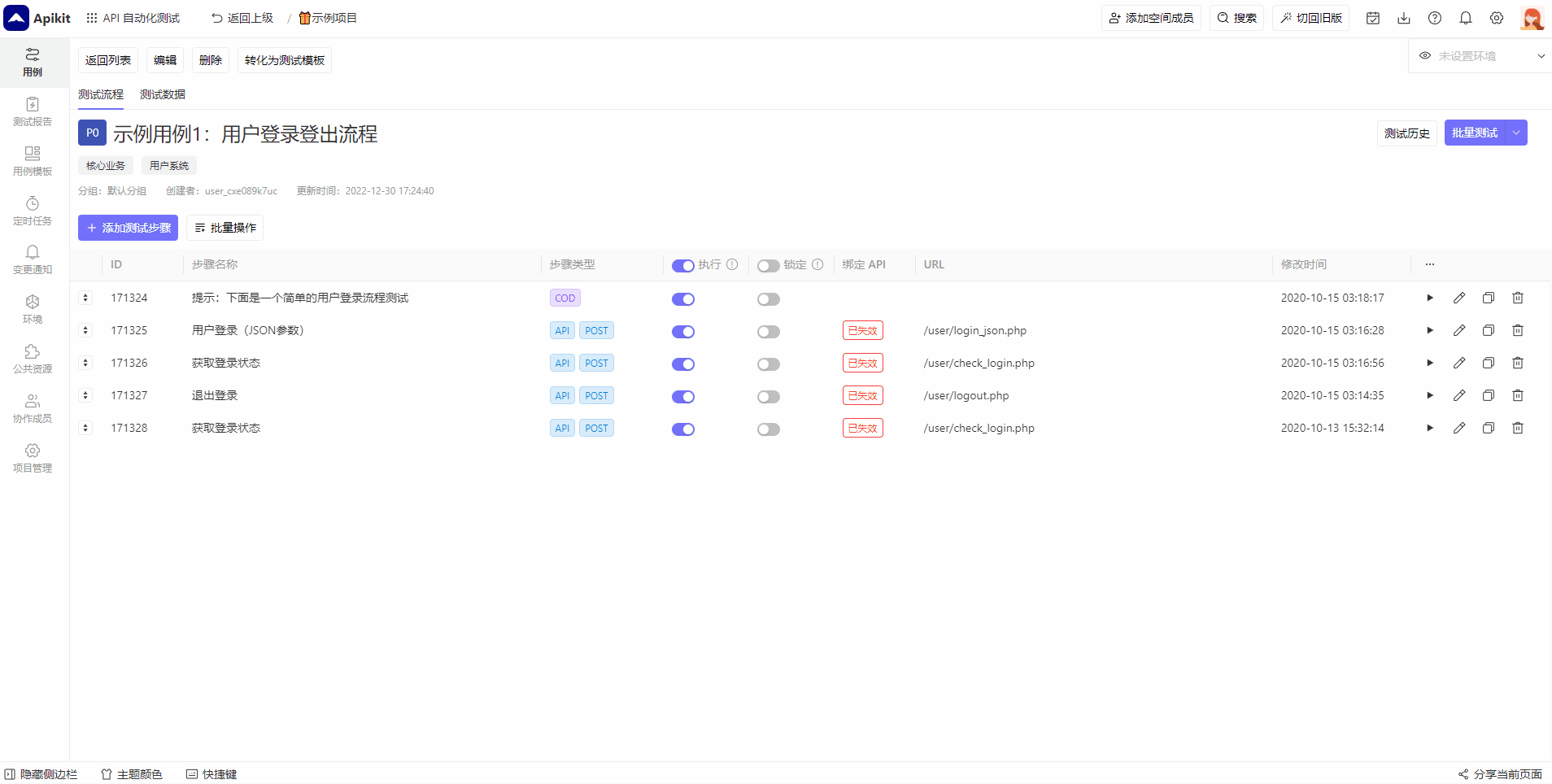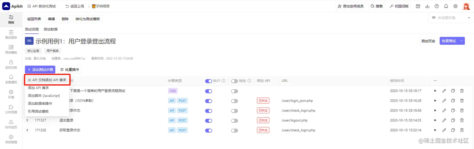 Apikit 自学日记:从 API 文档添加请求 CV_coder 2023-07-05 79 阅读1分钟 进入流程测试用例详情页,点击添加测试步骤,在下拉菜单中选择 从 API 文档添加API请求。 系统会弹出API选择弹窗,你可以在弹窗中选择API所在的项目、分组,并且选择需要导入的API文档。 通过导入API文档来创建测试步骤时,会自动将测试步骤关联相应的API文档,当API文档发生改变的时候,测试人员可以方便地同步改变的信息到测试用例中。降低维护测试用例的成本。 如果你已经在 API 文档中创建好了相应的API测试用例,你也可以直接将API测试用例导入自动化测试用例中。