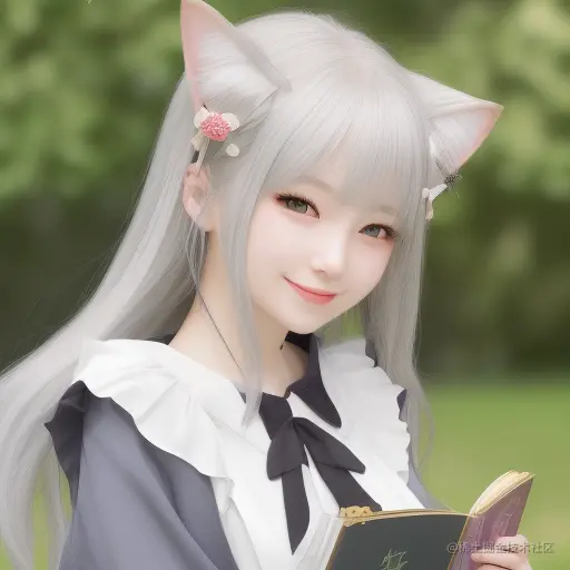 Depth of field, crossed bang, holding book, summer festival, female, official art, extremely detailed CG unity 8k wallpaper, best quality, masterpiece, highly detailed, absurdres, close up portrait, exquisite facial features, prefect face, student, cat ears, longeyelashes, sailor shirt, JK, bare_legs, no socks, brooch, pout, grin, pure, yokozuwari, light smile, silver hair